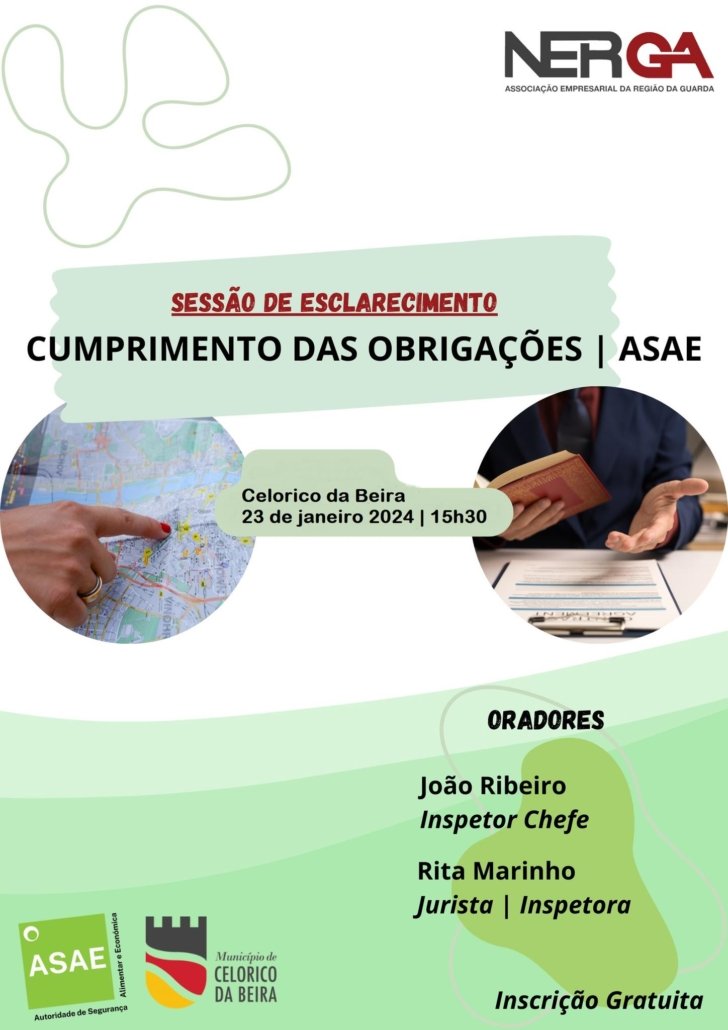O NERGA, o Município de Celorico da Beira e a ASAE promovem no dia 23 de janeiro (terça-feira), pelas 15h30, no Salão Nobre da Câmara Municipal, a Sessão de Esclarecimento “Cumprimento das Obrigações – ASAE”, dirigida principalmente ao setor da hotelaria, restauração e similares (cafetaria, pastelarias e Bares …)